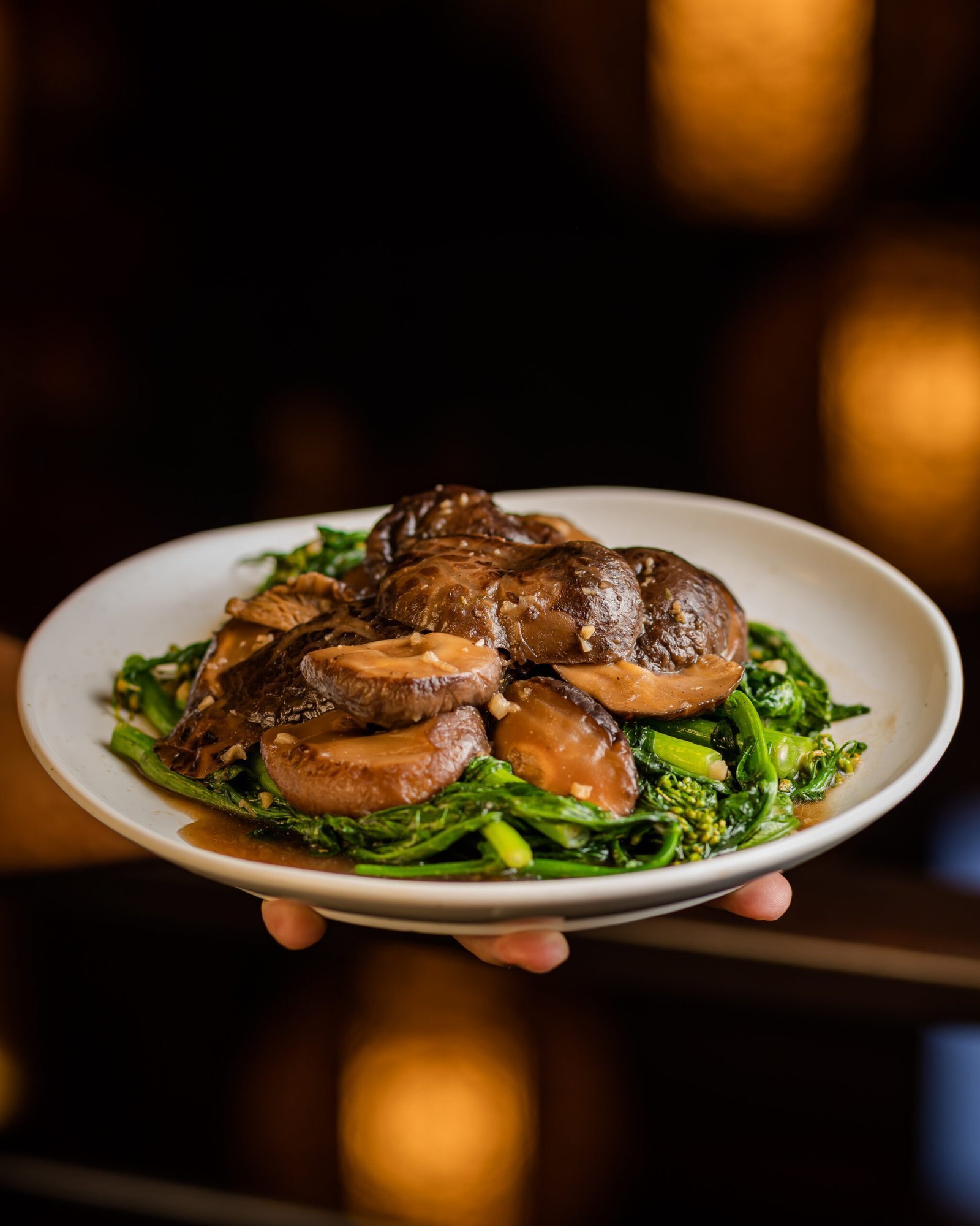 Hojas de mostaza salteada, champiñones, ajo y zanahorias.