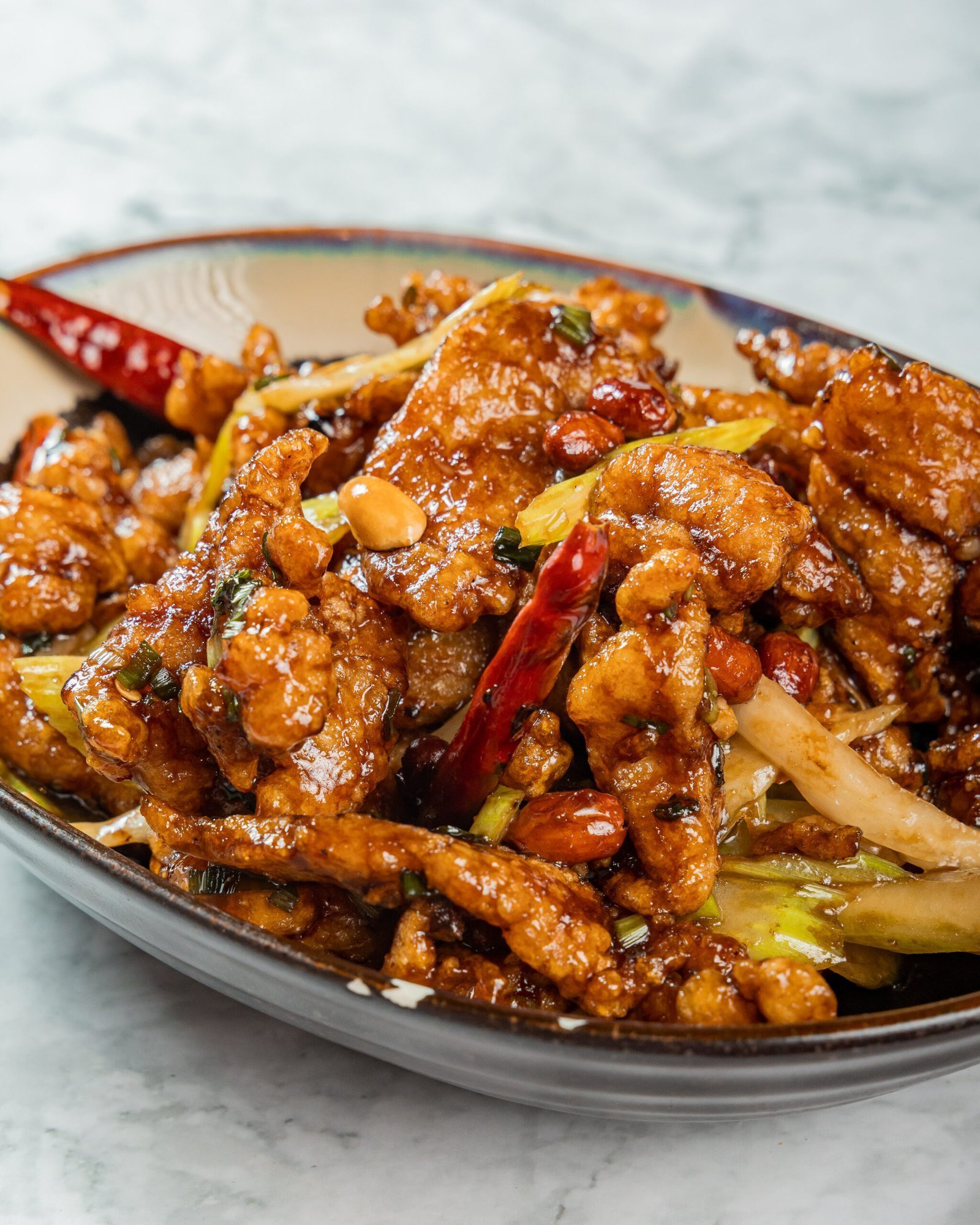 Pollo salpimentado en wok con chile picante, con toppings de mani y apio.